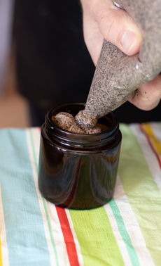 After the sterilization and drying process, the coffee grounds are then mixed with our other ingredients, containing the coconut oil, sugar, and essential oils.